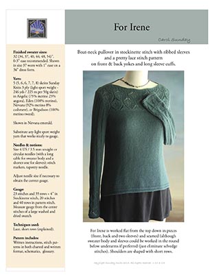 Kit includes 5 (5, 6, 6, 7, 7, 8) 50-gram skeins 3 ply yarn for finished sweater sizes 32 (34, 37, 40, 44, 48, 54)"