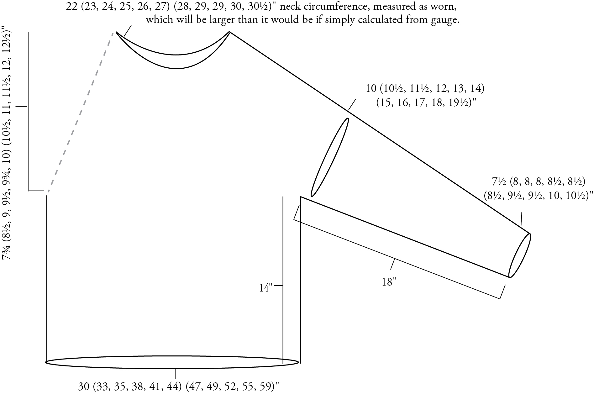 Finished sweater measures: 30 (33, 35, 38, 41, 44) (47, 49, 52, 55, 58)". 0-3" ease recommended. Shown in Graphite in size 38, worn with 2" ease, and in Rain in size 35 worn with -1" ease (a little snug). | |||