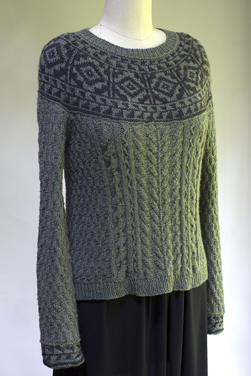 Techniques used: Provisional cast-on, stranded knitting, reading charts, cable decreases, short rows, afterthought pockets.