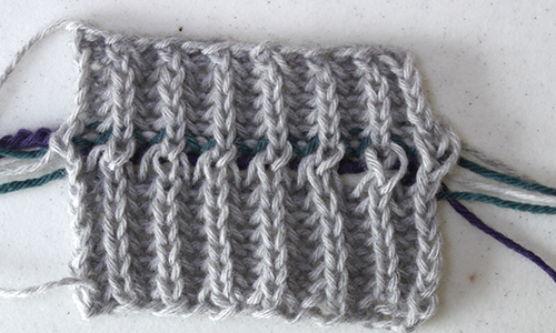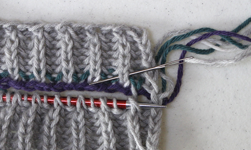 Beginning: Following the path of the green yarn, draw needle up behind the two right legs in the purl column as shown.