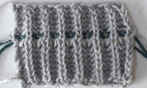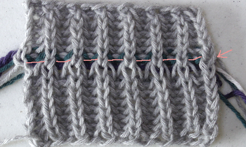 Beginning: Following the path of the green yarn, draw needle down behind the two left legs in the purl column as shown.