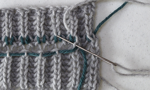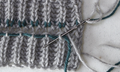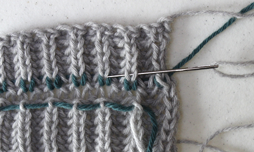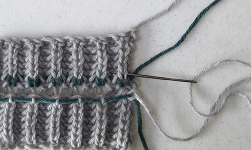 End. Draw needle purlwise through both strands of the next knit stitch.