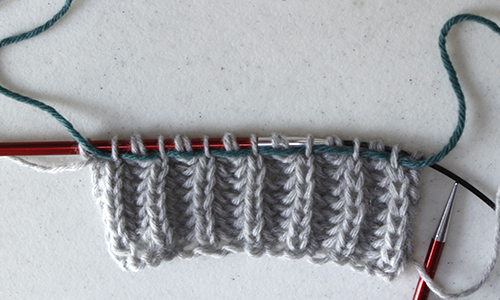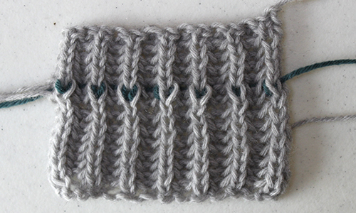 With a second piece of scrap yarn in another contrast color (green shown here) work a WS brioche setup row as follows: Sl1, k1, [slyo, k1] to last st, sl1.