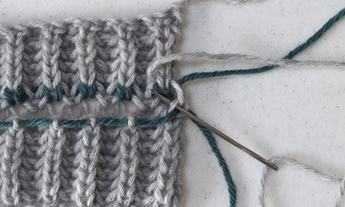 WIth WS facing, and using the second color of contrast scrap yarn, thread the scrap yarn through the stitches that present as knit stitches.