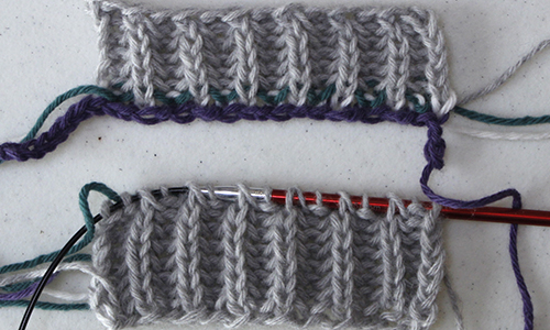 With a contrast color of scrap yarn and using provisional method, cast on the number of stitches desired. In the picture above, this cast on row is in white yarn. (Crochet chain is in purple).