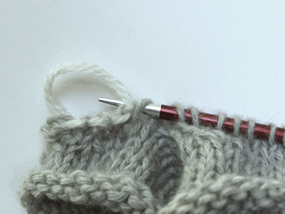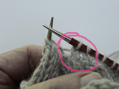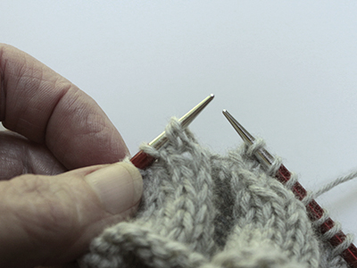 Now we've begun knitting; work to 1 stitch before the first picked-up strand and slip 1 knitwise, then insert the right needle purlwise into the back loop of the strand, as shown above, to knit those two together.