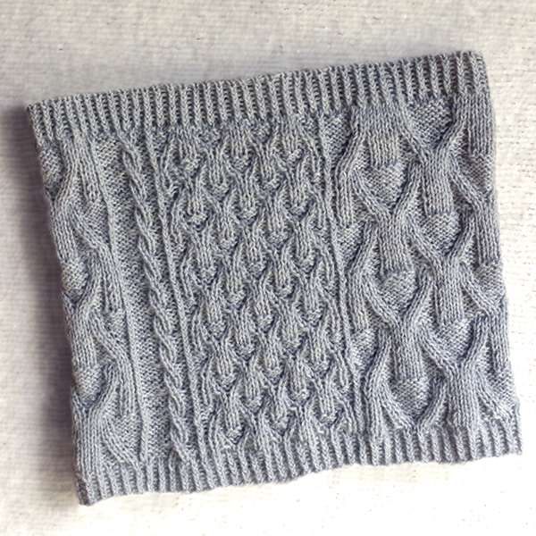 I've always loved the classic stitch pattern called Wickerworks, and for this cowl, I used that stitch pattern along with a very scaled-up version of it, and threw in a lovely narrow cable and some twisted ribs. |