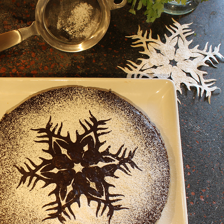 Decorating Robert's flourless chocolate cake for our little holiday party. posted December, 2017.