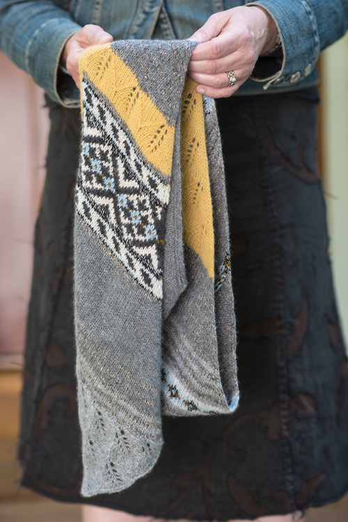The beautiful woven textiles and motifs of America's indigenous southwest peoples have inspired a lot of my designs, including this, my newest bias knit scarf. I love its spirited tribal vibe, as well as its ability to ward off knitting boredom with a variey of techniques: stripes, a little stranded colorwork, and an easy lace. |