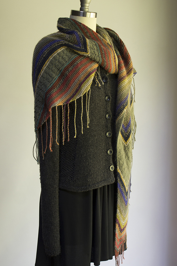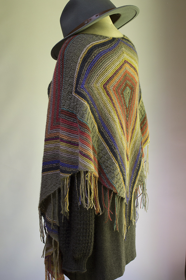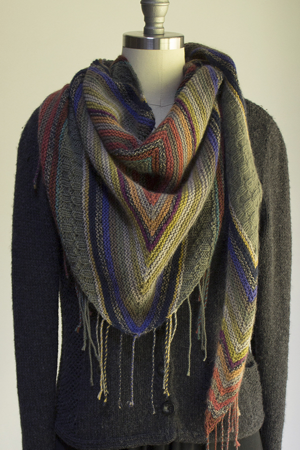 Southwest-inspired garter stripes form the main texture of this shawl, punctuated with a pretty staggered rib. We especially love the distinctive kite motif in the back! And notice how nicely it hugs the shoulders, making it really easy to wear.