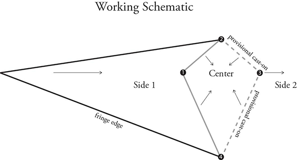 The construction is unique. Kiteback is worked from outer tip to widest point, then circling inward to the very center, then back out, decreasing to the far tip. |