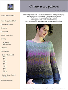 Kit includes Sunday Knits 3-ply sport-weight yarns in mostly Brigadoon (100% merino tweeds & marls), with a little bit of Nirvana (merino cashmere) in a total of seventeen colors.