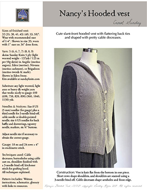 Nancy's Hooded Vest Kit includes Sunday Knits 5 ply (worsted weight) yarn: