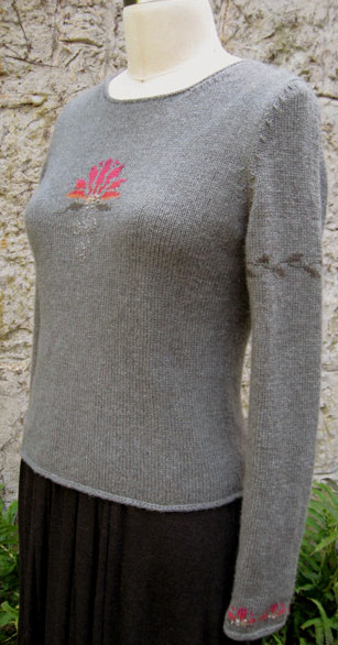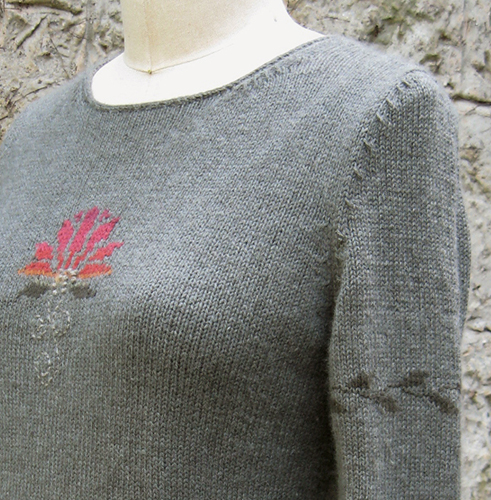 A classic pullover with charming touches of colorwork: lotus flowers in front and around wrists, and a vine winding around the left upper arm ... |