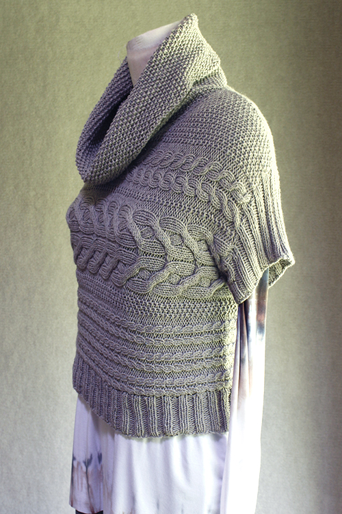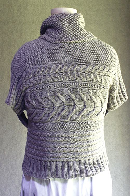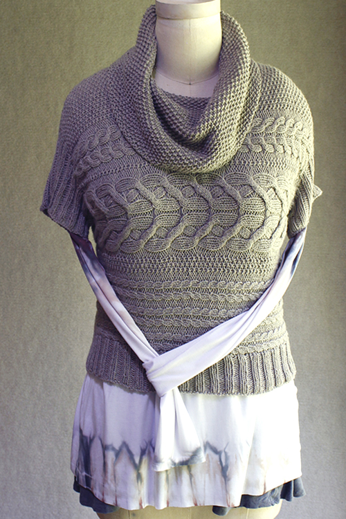 Mrs. Grimmet is my local style guru. I borrowed some ideas from her wardrobe, and the result is this cowl-neck, cabled, sideways-knit pullover. It was a fun knit, and turned out so wearable! |