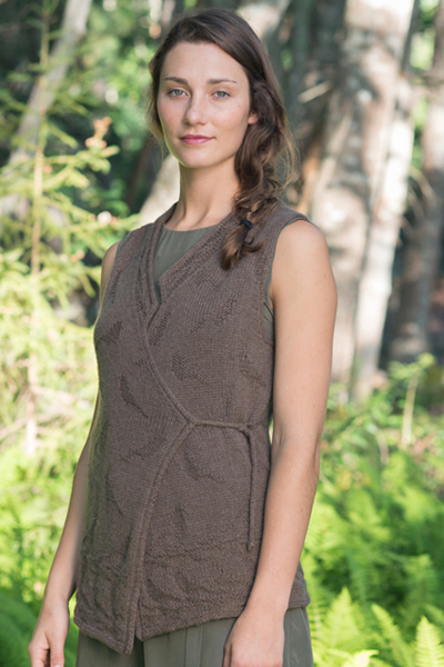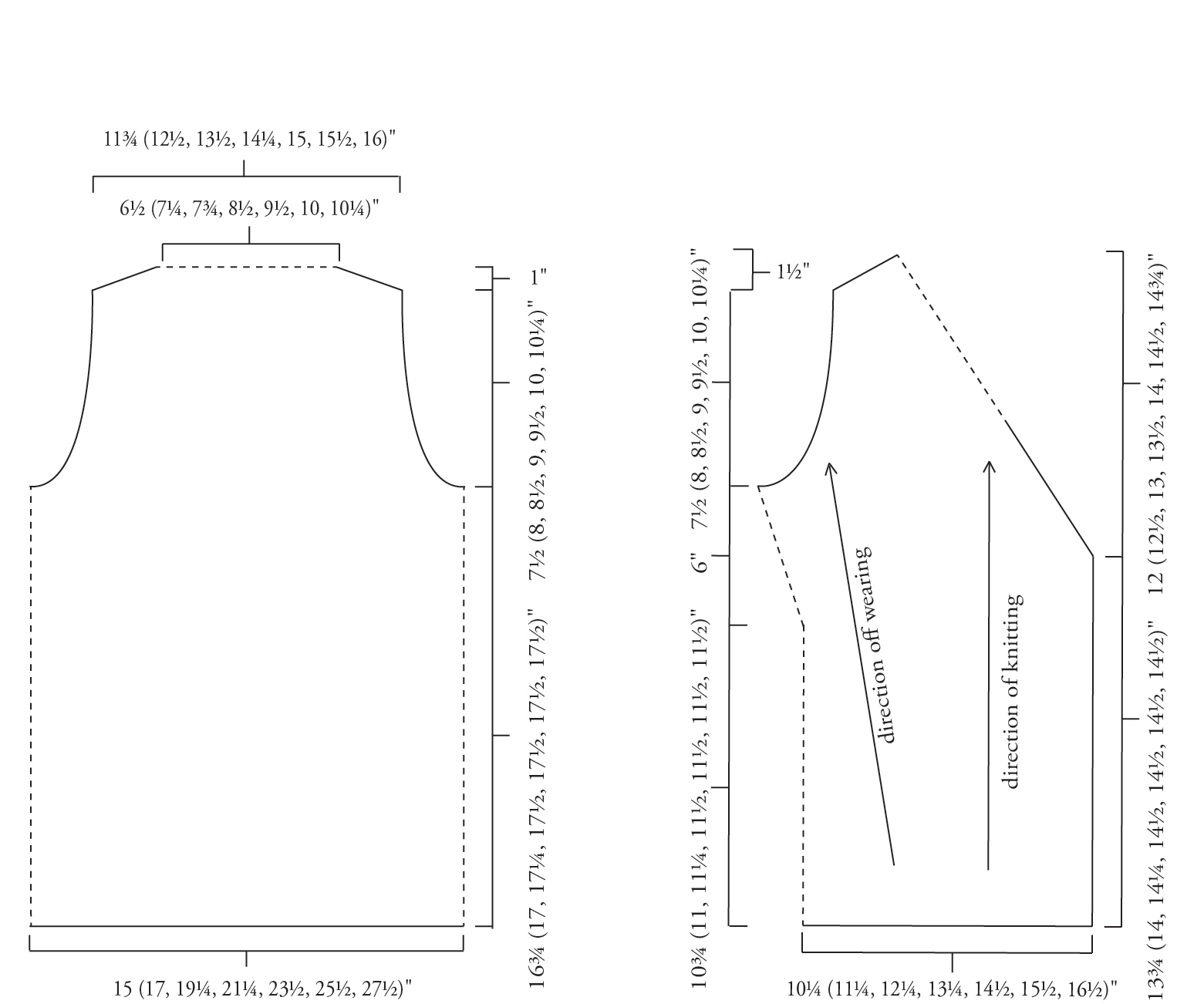 Sizes of finished vest: 30 (34, 38, 42.5, 47, 51, 55)". Wear with recommended ease of -3 to +1". Shown on model in size 34 worn with 0 ease, and on dress form in size 36" (modified by working size 38 at a smaller gauge) also with 0 ease.