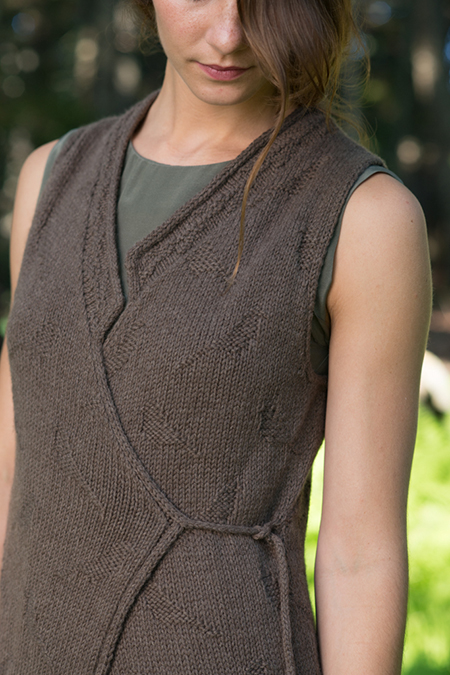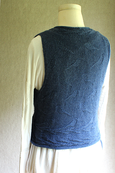 The vest is knit flat in one piece from the bottom up, with slant-shaped fronts, a bit of I-cord trim, and a Nehru-style lapel.