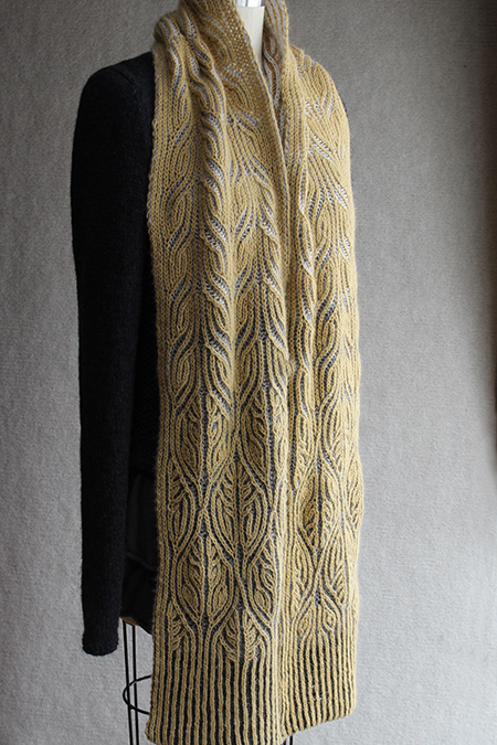 Needles: Size 5 US / 3.75 mm for scarf, size 6 US / 4 mm for cast on, size 3 US / 3.25 mm for ribbed borders.
