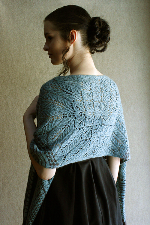 Knitting begins in the center back, with twisted-stitch lace worked in the round to form a flat square until the shawl reaches it's full width. |