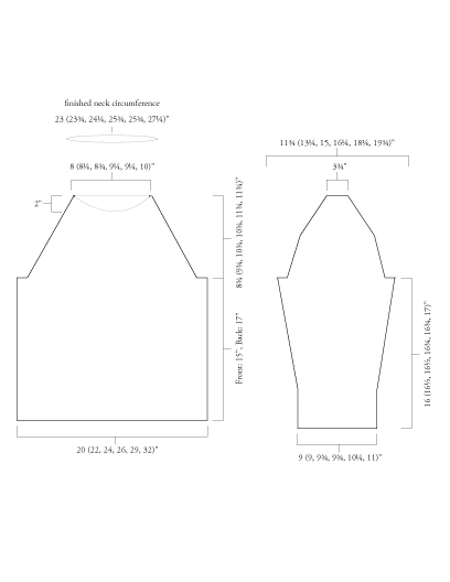 Sizes of finished sweater: 40 (44, 48, 52, 56, 60)". Wear with recommended ease of 6-10". Shown in size 44 worn with 8" ease.