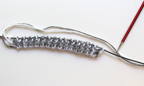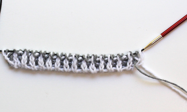 - Each row is worked twice, first with color A (slipping color B sts), then with color B (slipping color A sts).
