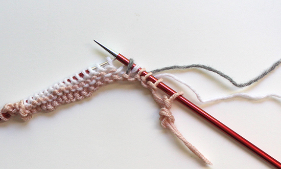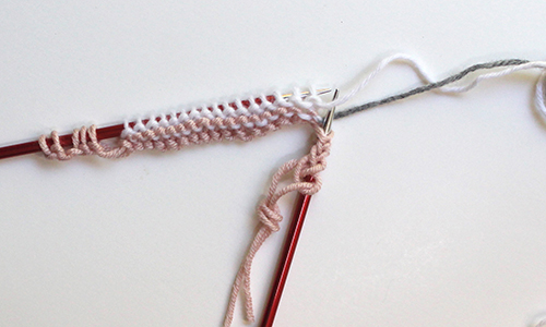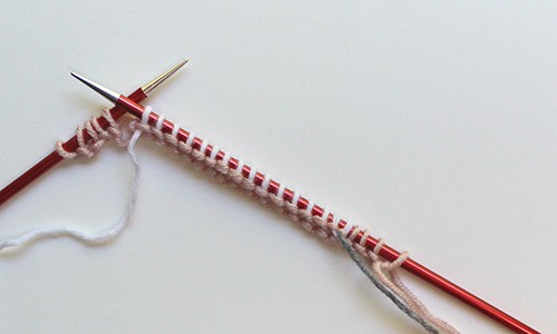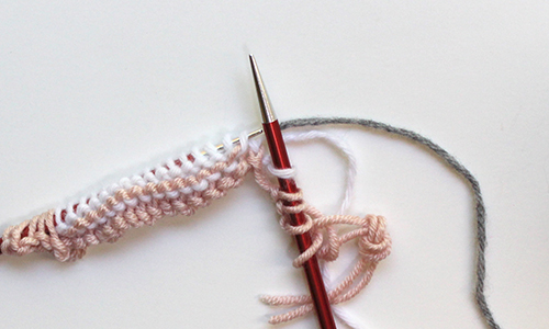 Next Row: With CA purl 1, * bring both CA and CB strands to back, locate purl bump between 1st and 2nd sts of first working-yarn row,