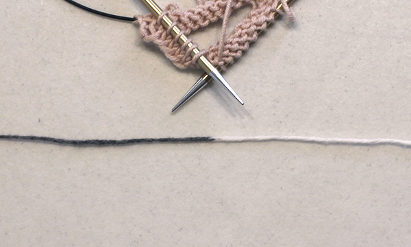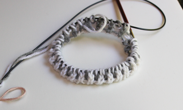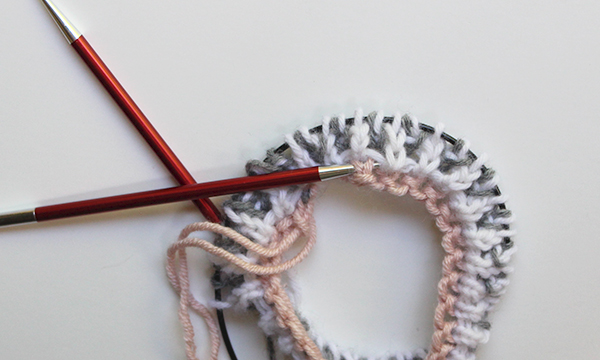 Switch to gauge-size needles and cont with CA, knit 2 rnds.