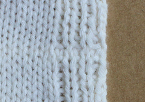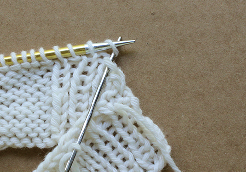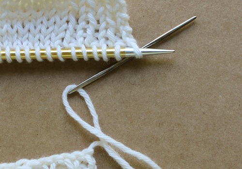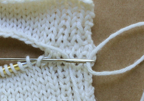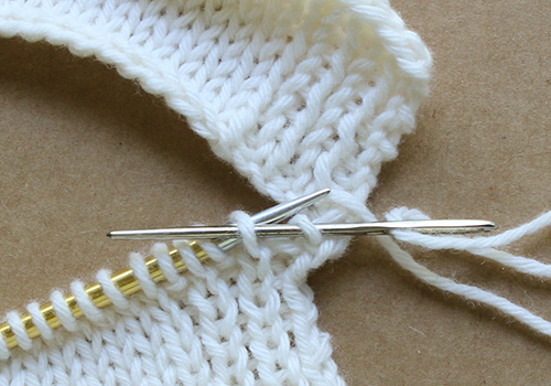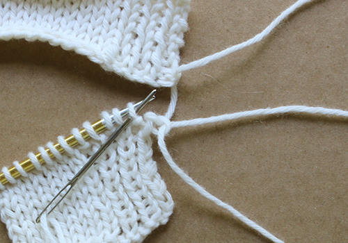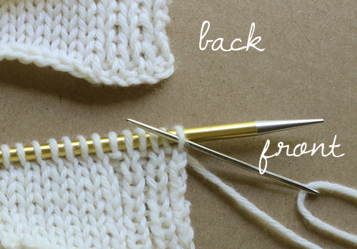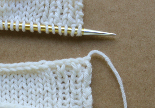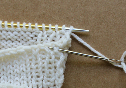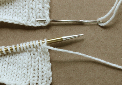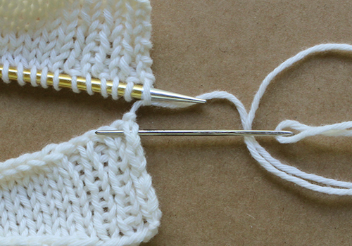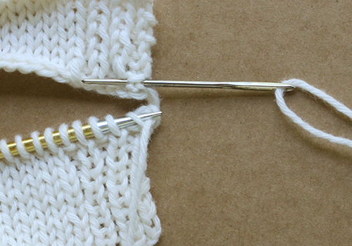 * Back edge: Run tapestry needle, from right to left, behind first (knit) stitch and draw through.