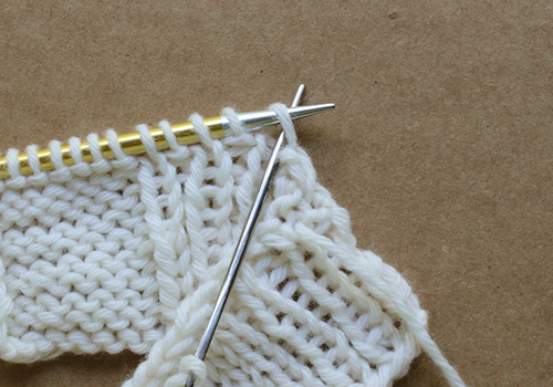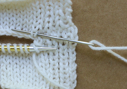 Back edge: Run tapestry needle, from right to left, behind the first leg only of next (knit) stitch and draw through.
