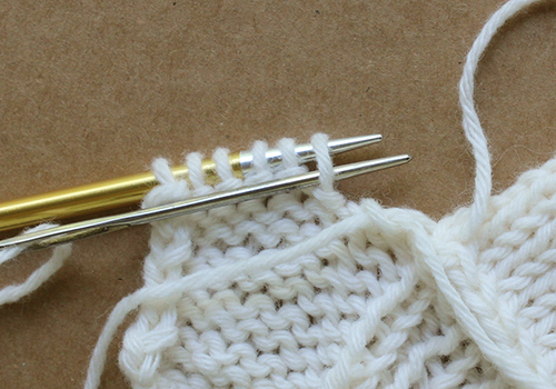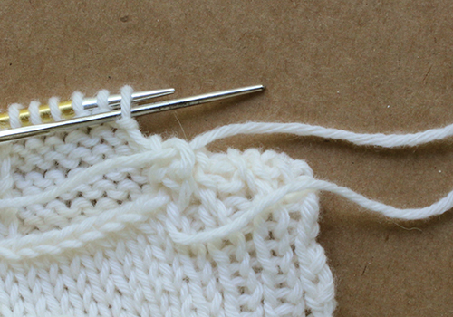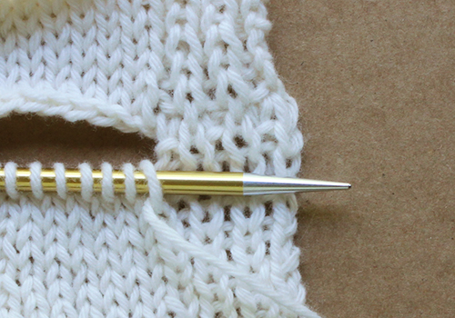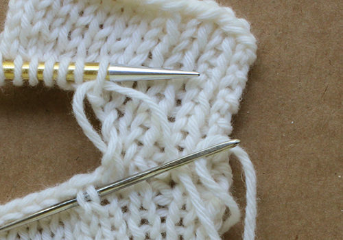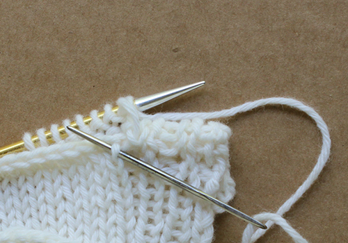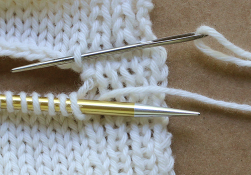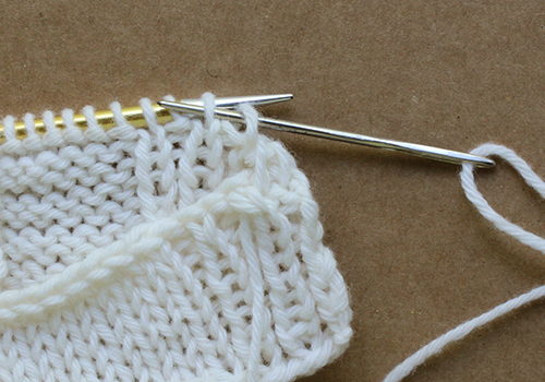 Repeat from * until next stitch on the back edge is the first stitch of the stockinette portion.