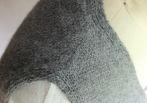 We'll work the left shoulder first. The back shoulder stitches have been bound off; the front stitches are still on the needle, with a long tail threaded onto a tapestry needle ...