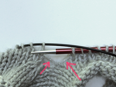 Now we've begun knitting; work to 1 stitch before the first picked-up strand and slip 1 knitwise, then insert the right needle purlwise into the back loop of the strand, as shown above, to knit those two together.