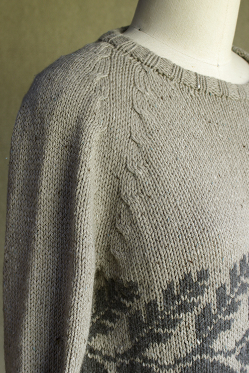 Techniques used: Provisional cast-on, stranded knitting, reading charts, cable decreases, short rows, afterthought pockets.