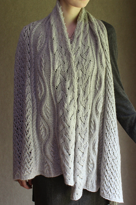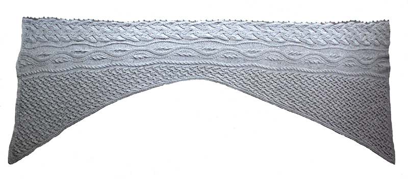 Shawl is worked in one piece flat from end to end. It starts wide, narrows in center to fit nicely around the neck, and then widens out to the other end. |