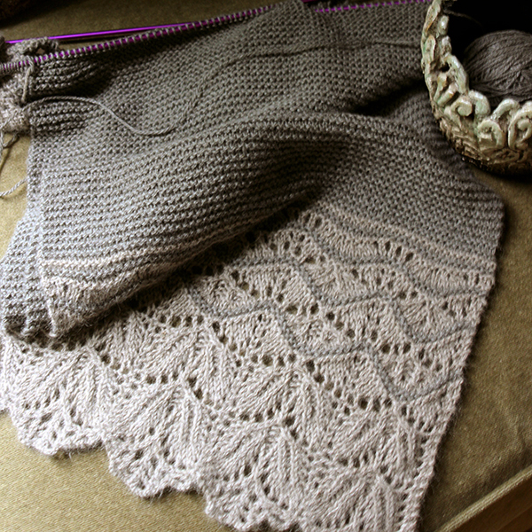 Ethereal leafy lace border is set off perfectly with this classic garter-stitch scarf or shawl. |