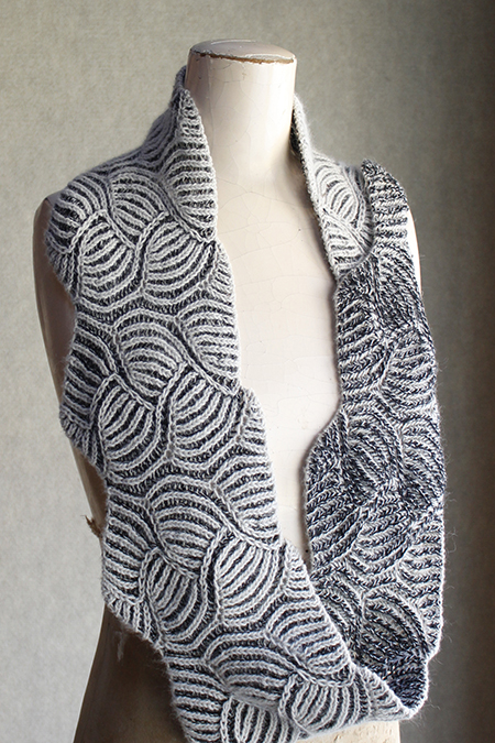 Don't be intimidated by the flowing and distinctive pattern in this cowl. It uses only the very most basic brioche stitches. And a clever technique makes every round a knitwise round - all brks and no brps. It's perfect for a beginning briocher, and fun for anyone who enjoys the pleasures of brioche knitting.